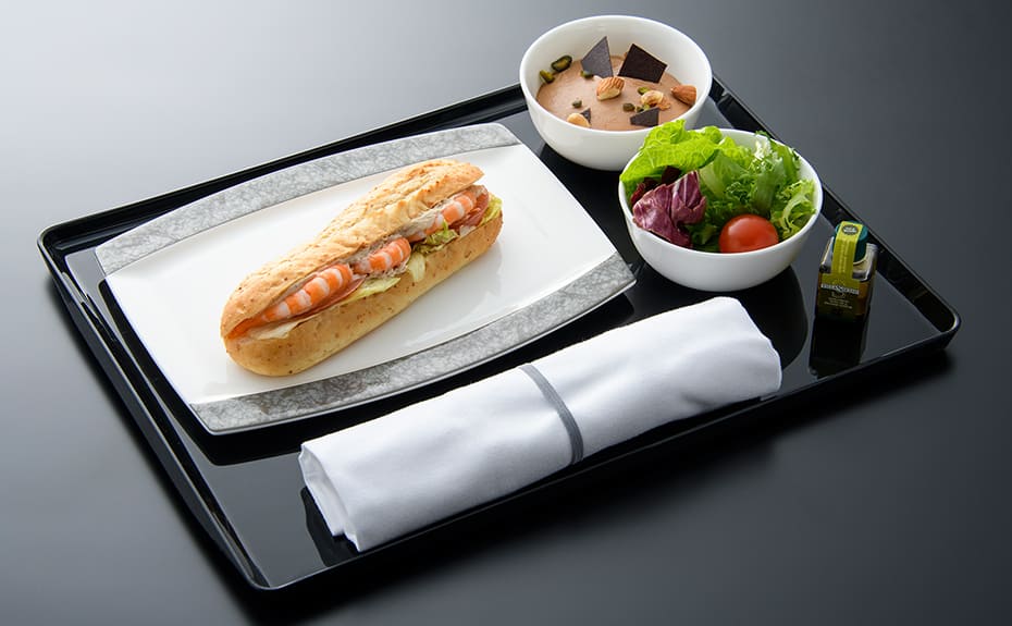 離陸後に提供するコースのお食事(アミューズ・前菜・主菜・デザート)に変えて、ワントレー(サラダ・サンドイッチ・デザートの3品)のお食事を提供します。